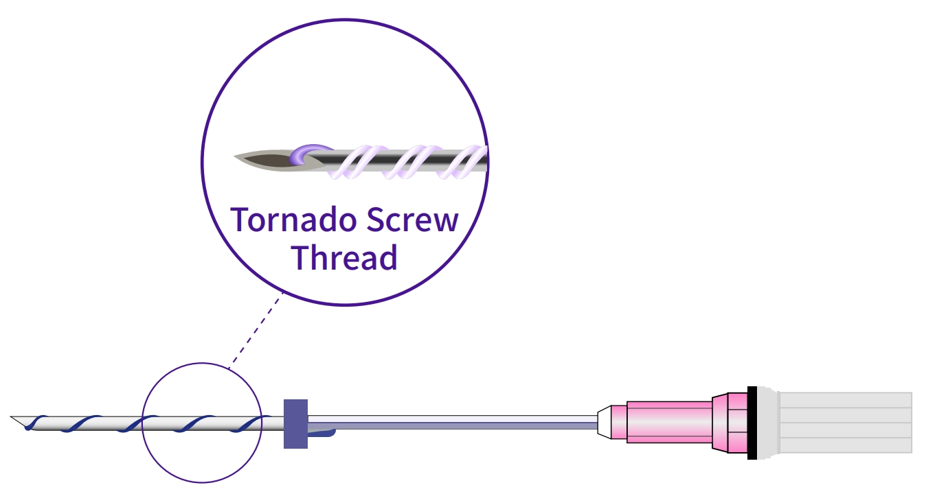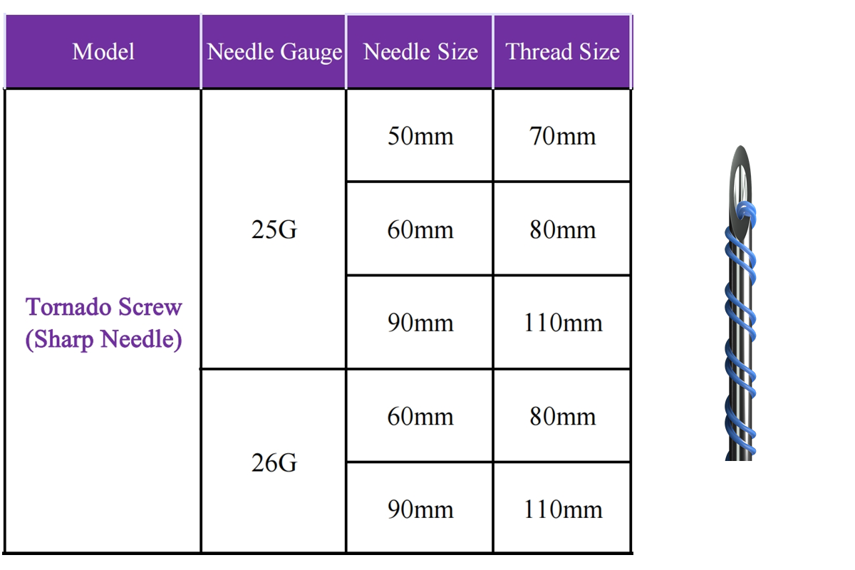 The TORNADO SCREW is a twisted pair of two mono-PDO threads combined into a single thread and assembled on the needle in a spiral form in the likeness of a tornado. Screw threads provide good volume restoration to sunken areas of the skin.